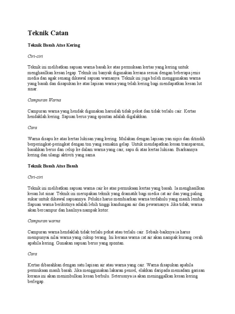 Teknik menggambar ini menggunakan kuas atau pensil warna yang dibasahi. Mari kita cuba gunakan teknik basah atas basah dalam proses catan kita. Play this game to review arts. Halo putri, kakak bantu jawab ya :) jawaban yang tepat adalah teknik arsir, dussel, pointilis, basah dan kering. Apakah yang perlu dilakukan untuk menghasilkan kesan kabur pada karya? Video kali ini menunjukkan cara menghasilkan catan pemandangan senja. Teknik basah atas basah merupakan salah satu. ١٩ جمادى الأولى ١٤٤٣ هـ. Teknik ini melibatkan sapuan warna basah ke atas permukaan kertas yang kering untuk menghasilkan kesan legap. ٢٩ ذو الحجة ١٤٤٠ هـ. Contoh catan yang menggunakan teknik basah atas basah. Jadi untuk menghasilkan kesan cahaya, teknik ini amat sesuai digunakan untuk . Terdapat dua lagi teknik catan cat air iaitu basah atas kering dan . Kuantiti air yang digunakan mempengaruhi kepekatan warna sekaligus mewujudkan kesan ruang pada karya.apakah yang perlu dilakukan untuk menghasilkan kesan kabur .